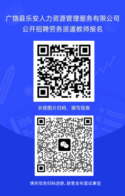 广饶县乐安人力资源管理服务有限公司公开招聘劳务派遣教师公告发表时间:2025-08-19 14:16 因工作需要,广饶县乐安人力资源管理服务有限公司面向社会公开招聘劳务派遣教师,现将有关事项公告如下: 一、招聘学科 语文、数学、英语、科学、音乐、体育、美术、信息科技、书法。 二、招聘条件 (一)基本条件 1.拥护中国共产党的领导,热爱社会主义;热爱教育事业,具有良好的职业道德;遵纪守法,品行端正无不良行为记录。 2.具备国家承认大学本科及以上学历,精通学科专业知识,具备基本的教师素质和能力。 3.取得与招聘岗位要求一致的教师资格证。 4.身心健康,具有正常履行教师工作职责的身体条件,具有良好的协作精神和敬业精神,善于沟通交流,具有亲和力和责任心。 5.师范类毕业生或有教学经验者优先录用。 (二)有下列情形之一的,不得报名 曾受过刑事处罚或曾被开除公职的人员,被依法列为失信联合惩戒对象的人员,在读全日制普通高校非应届毕业生,现役军人,服务年限(含试用期)未满的机关事业单位工作人员,以及法律法规政策规定不得聘用的其他情形的人员不得应聘。 三、派出单位 广饶县大王镇实验小学 四、工资待遇 拟聘用人员由广饶县乐安人力资源管理服务有限公司进行统一劳务派遣管理,薪酬福利待遇按照劳务派遣有关要求发放。 五、招聘流程 (一)报名 (1)报名时间:2025年8月19日-8月21日15:00,逾期不予受理。 (2)报名方式:网上报名,扫描二维码填写报名信息并进群。 (二)资格审查及面试 1.面试时间:具体时间见群内通知。 2.面试地点:广饶县孙武路与乐安大街交汇处全福元B座5楼505室。 (1)携带身份证、毕业证、教师资格证、普通话证书及复印件参加面试,面试时对报名参加招聘人员的以上材料进行资格审查。 资格审查工作贯穿公开选聘工作全过程,凡在后续工作中发现不符合应聘资格或弄虚作假等问题的,一经查实,立即取消应聘资格。 (2)经审查合格者,组织参加10分钟小学教材试讲面试、答辩,具体程序、标准由招聘单位自主确定。 六、报名咨询电话 王老师:18764594188 张老师: 15254611429